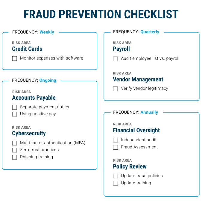 To keep things simple, we created a checklist of items you should be reviewing periodically for signs of fraud: